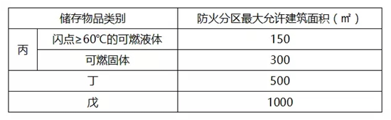 4、丙、丁、戊類物品庫房的防火分區(qū)允許最大建筑面積應符合下表的規(guī)定。當設(shè)置有火災自動報警系統(tǒng)和自動滅火系統(tǒng)時,允許最大建筑面積可增加1倍;局部設(shè)置時,增加的面積可按該局部面積的1倍計算。